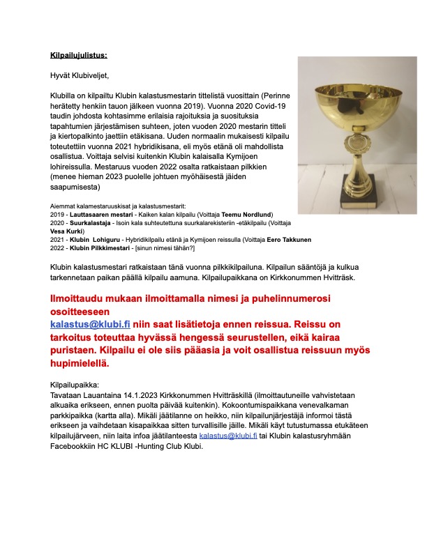 Kaikki Klubin kalastustoimintaan liittyvät tiedotteet lähetetään sähköpostitse ja sosiaalisen median kautta.