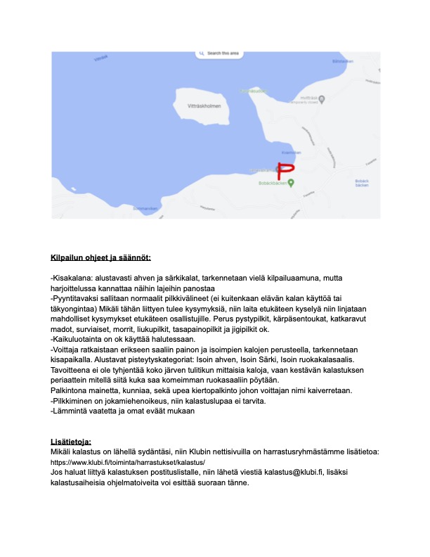 Mikäli olet kiinnostunut Klubin kalastustoiminnasta, niin voit liittyä Kalastustoiminnan sähköpostituslistalle, niin saat ennakkoon tietoa suunnitelluista retkistä. Samaa kautta voit myös toivoa liittymistä sosiaalisen median yksityiseen ryhmäämme.