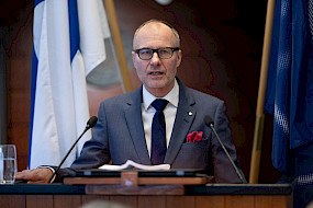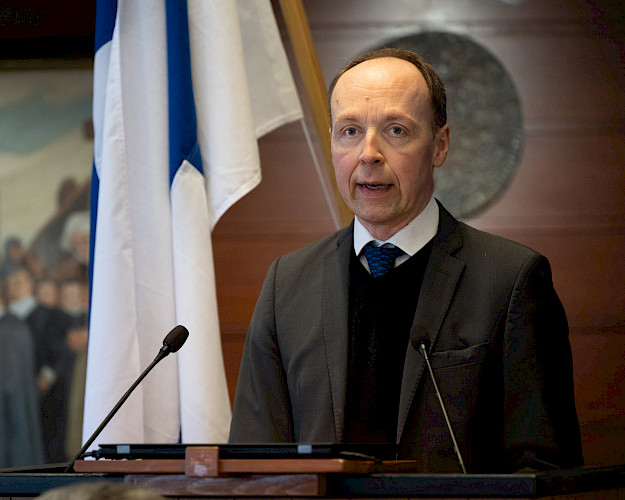 Eduskunnan puhemies Jussi Halla-aho jakoi palkinnot parhaille kirjoittajille 28.2.2024